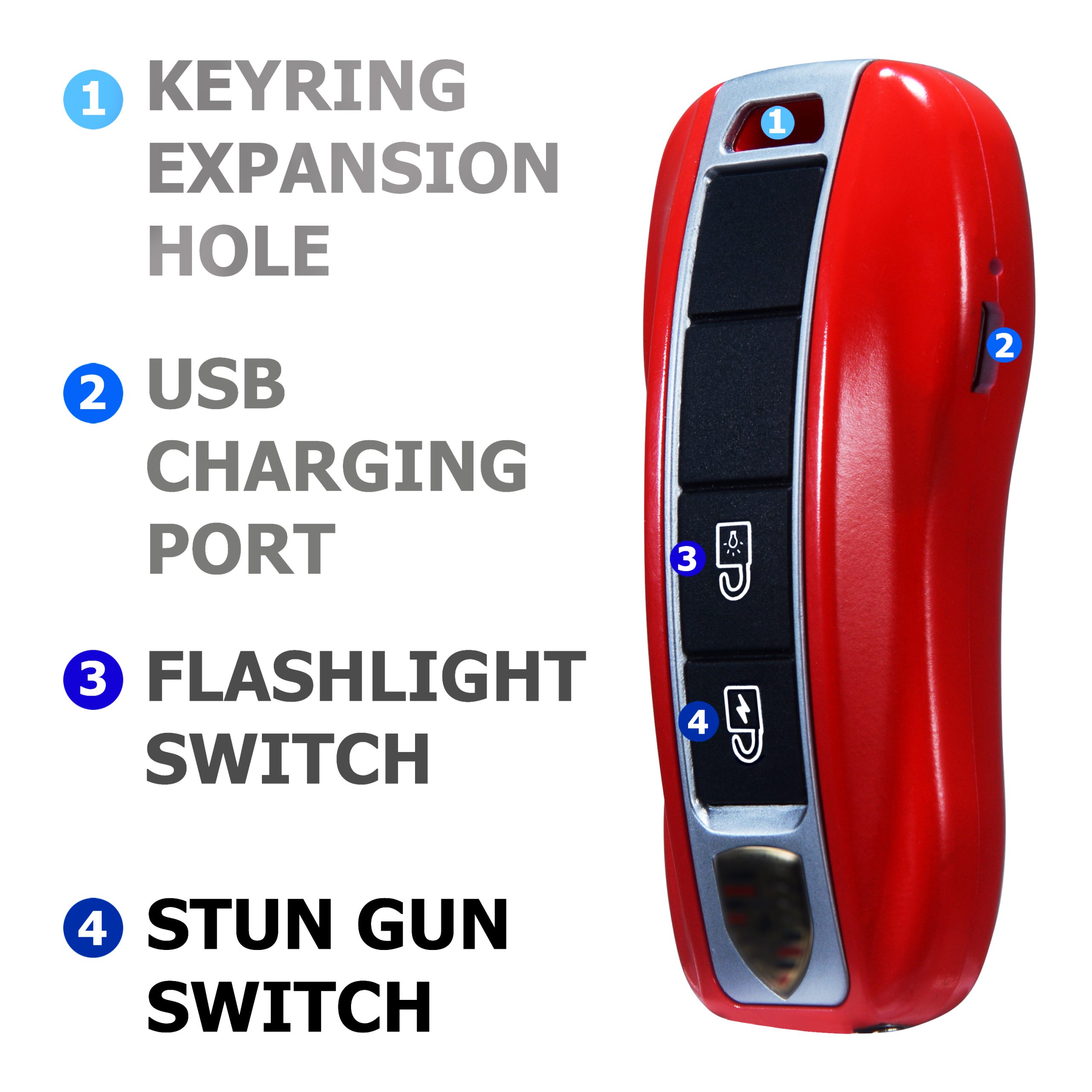- 【USB CHARGING & PORTABLE】: No need to waste money buying batteries for stun guns。The keychain is wrist wearable via lanyard. Easy to identify in purse or pocket. Features: Can carry multiple keys or little parts, easy to remove.